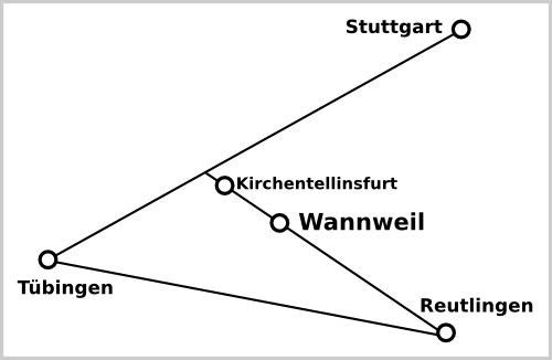 Von Reutlingen-Zentrum fahren Sie über Reutlingen-Betzingen Richtung B27/Stuttgart. Direkt nach Reutlingen-Betzingen kommt Wannweil.